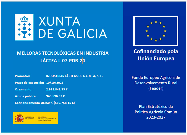 La empresa INDUSTRIAS LÁCTEAS DE NADELA, S.L. ha recibido cofinanciación del Fondo Europeo Agrícola de Desenvolvemento Rural (FEADER) para las inversiones en transformación y comercialización de productos agrarios del periodo 2023-2027. Gracias a esta cofinanciación ha sido posible ejecutar el proyecto "Melloras tecnolóxicas en Industria láctea" (L-07-PDR/24) destinado a la adquisición de nuevos equipos, desarrollado en las instalaciones de la empresa en Nadela (Lugo) en el año 2024 Y 2025, con un presupuesto de 2.998.848,33 € y una ayuda de 949.596,92 €
