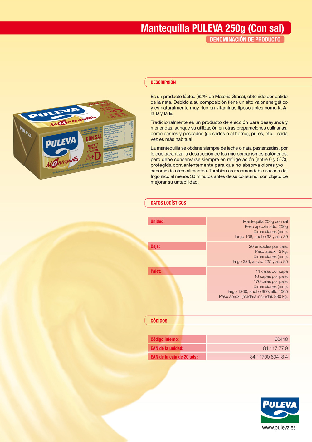 Puleva Mantequilla con sal es un producto lácteo (82% de Materia Grasa), obtenido por batido de la nata. Debido a su composición tiene un alto valor energético y es naturalmente muy rico en vitaminas liposolubles como la A, D y la E.