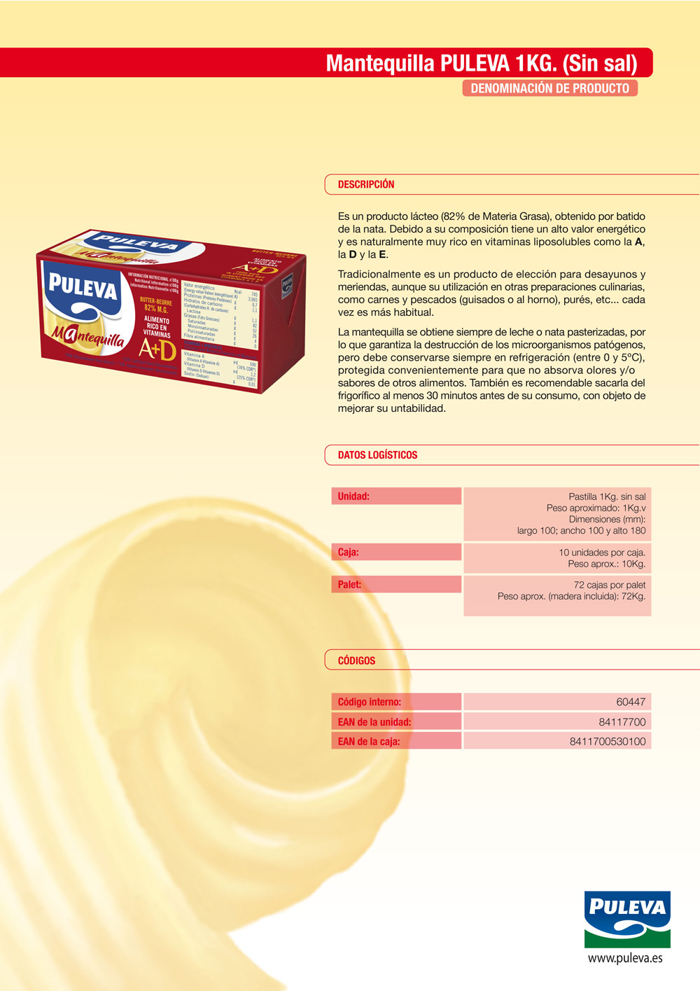 Puleva Mantequilla sin sal es un producto lácteo (82% de Materia Grasa), obtenido por batido de la nata. Debido a su composición tiene un alto valor energético y es naturalmente muy rico en vitaminas liposolubles como la A, D y la E.