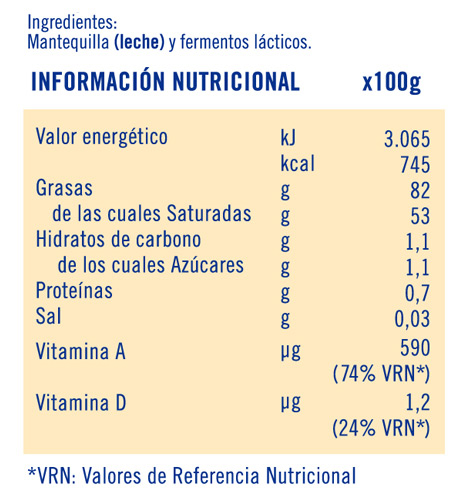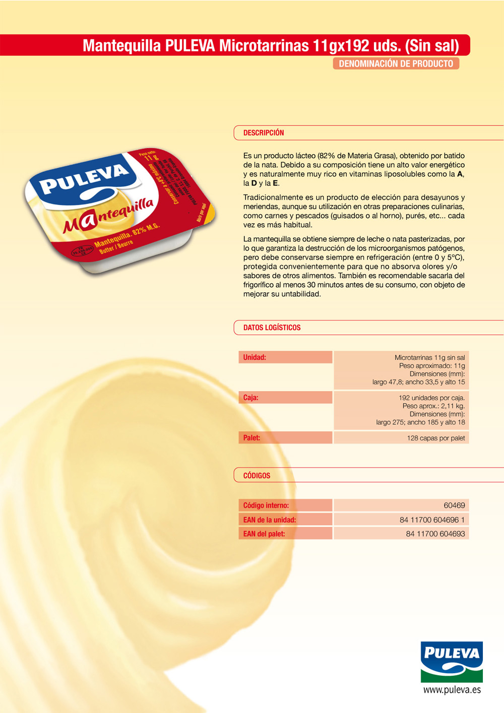 Puleva Mantequilla sin sal es un producto lácteo (82% de Materia Grasa), obtenido por batido de la nata. Debido a su composición tiene un alto valor energético y es naturalmente muy rico en vitaminas liposolubles como la A, D y la E.