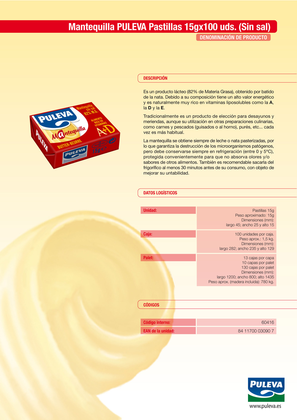Puleva Mantequilla sin sal es un producto lácteo (82% de Materia Grasa), obtenido por batido de la nata. Debido a su composición tiene un alto valor energético y es naturalmente muy rico en vitaminas liposolubles como la A, D y la E.