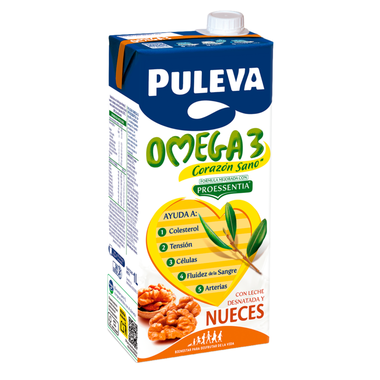Incorpora Puleva Omega 3 con Proessentia nueces a tu desayuno cada día, porque un corazón sano es un corazón contento, ya que un vaso de Puleva Omega 3 con Proessentia nueces aporta el 50% de la cantidad diaria recomendada de Omega 3*.